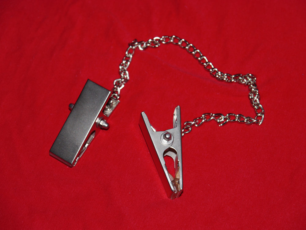 Bei uns können Sie auch außergewöhnliche Brustklammern aus Edelstahl erwerben. Sie sind mit quergerillter, transparenter Hartgummiauflage zum weicheren, aber dennoch festen Sitz versehen und mit einer 35 cm vernickelten Kette verbunden.