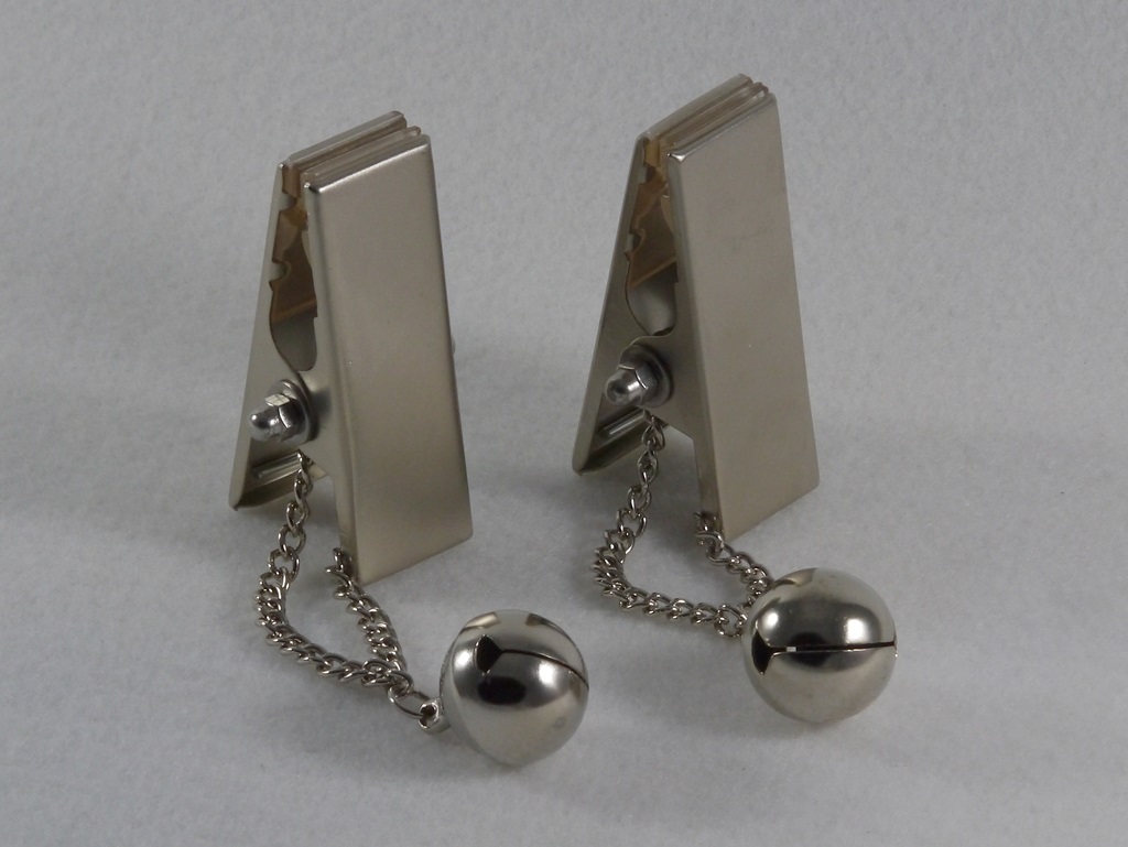 Als Variante zur Kette erhalten Sie die Brustklammern auch mit kleinen Glöckchen, die jeweils mit einem kleinen Kettchen an der Klammer befestigt sind.